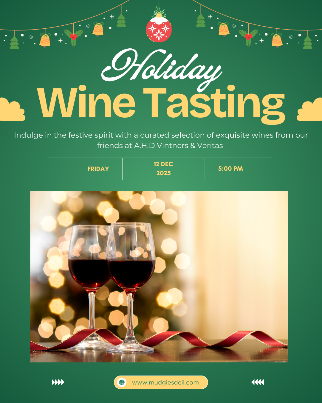 Holiday Wine Tasting- Friday December 12th from 5pm-7pm. Featuring holiday inspired selections from our friends, Whitney (A.H.D Vintners) & Gabrielle (Veritas). Come try some wines that will be perfect for any holiday gathering!