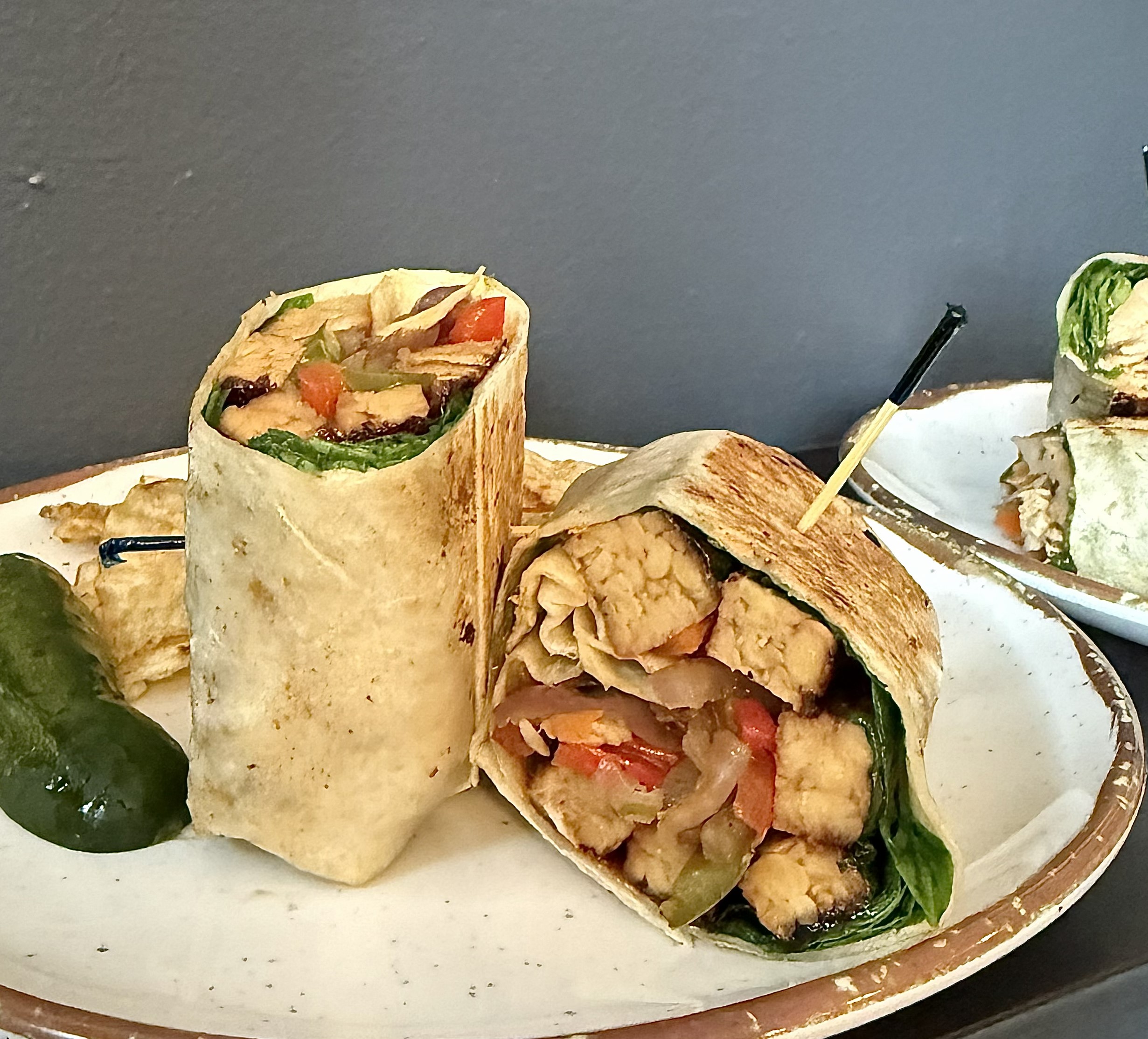 Special: Sweet & Sour Wrap- Your choice of chicken or tempeh topped with red and green peppers, carrots, red and white onions sautéed in sesame oil wrapped in a flour tortilla- $15