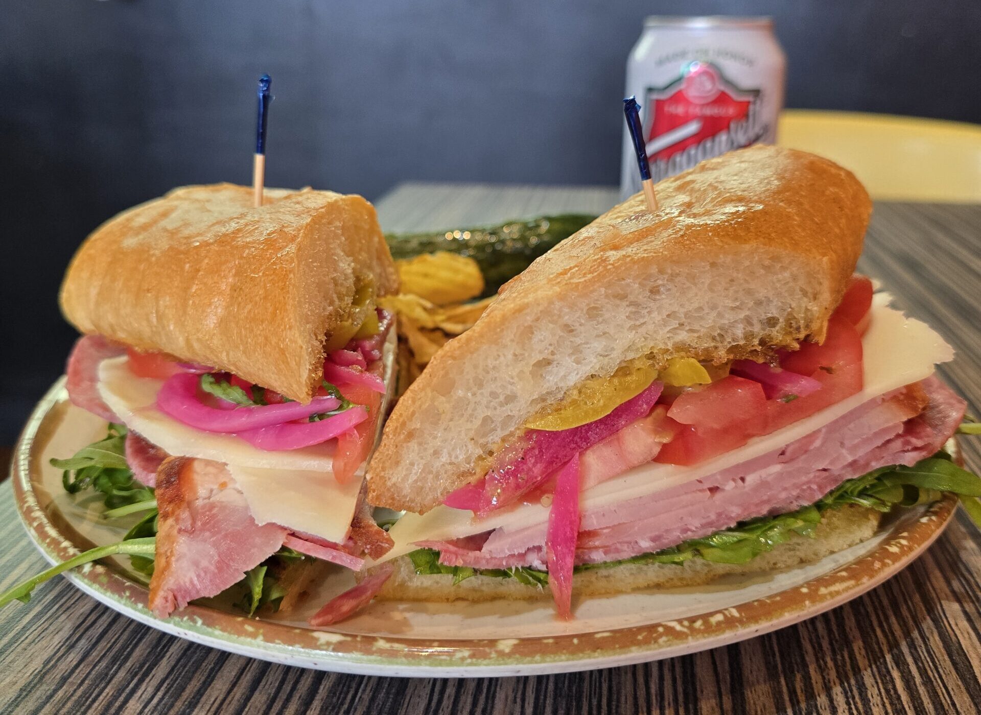 Italian Sub — ham, salami, provolone, arugula, tomato, pickled red onion, banana peppers, & house-made Italian dressing served cold on a sub bun — $17.00