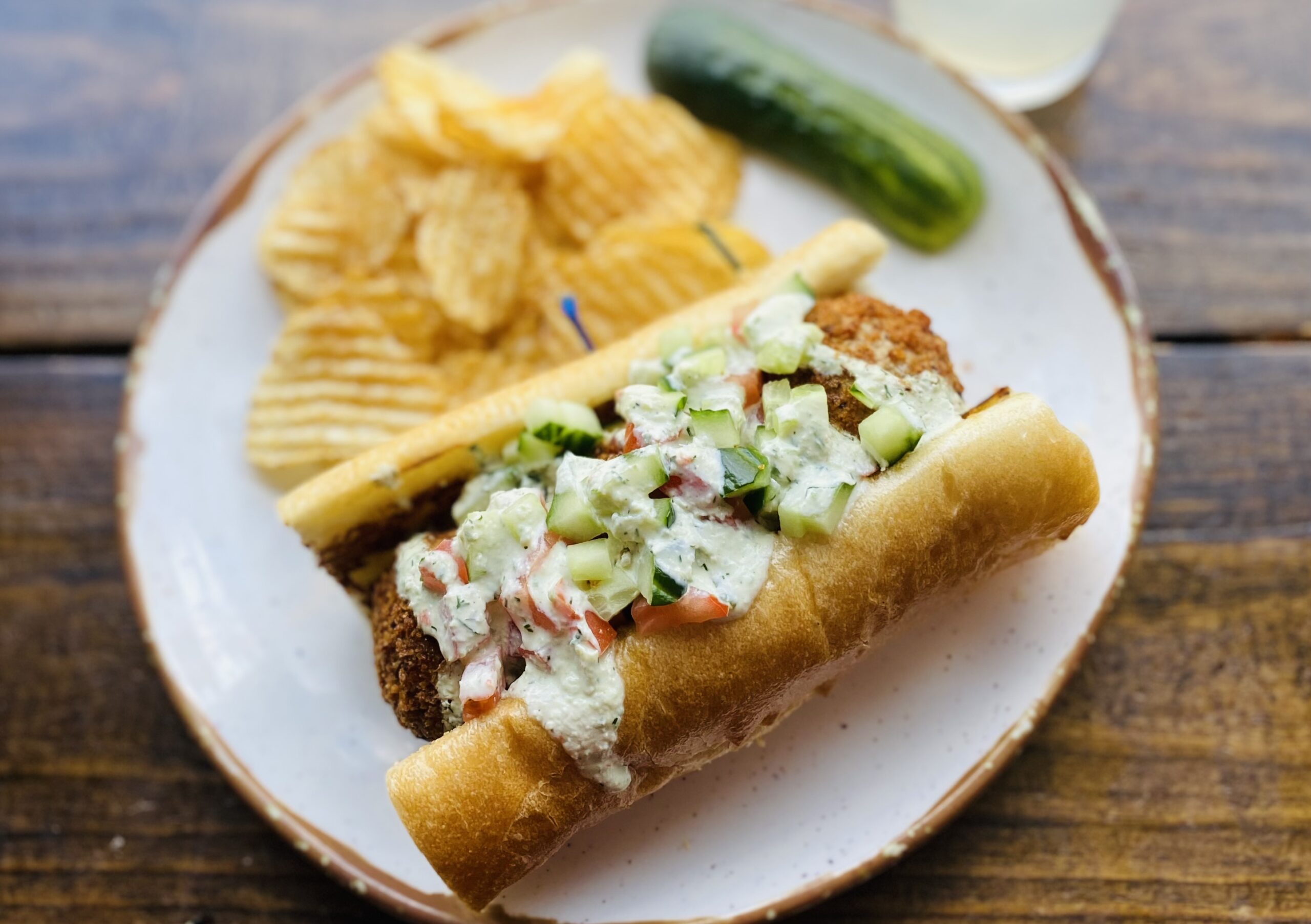 Falafel Sandwich- House made falafel patties topped with tomato, cucumber, feta cheese, tahini sauce, & tzatziki sauce served on a sub bun- $16