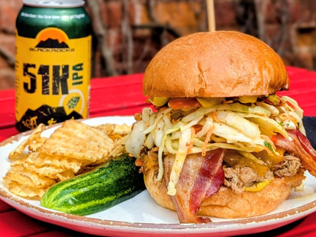That’ll Do- Smoked pulled pork, bacon, cheddar cheese, tri colored peppers, creamy coleslaw, and bbq mustard on brioche. Served warm–$16